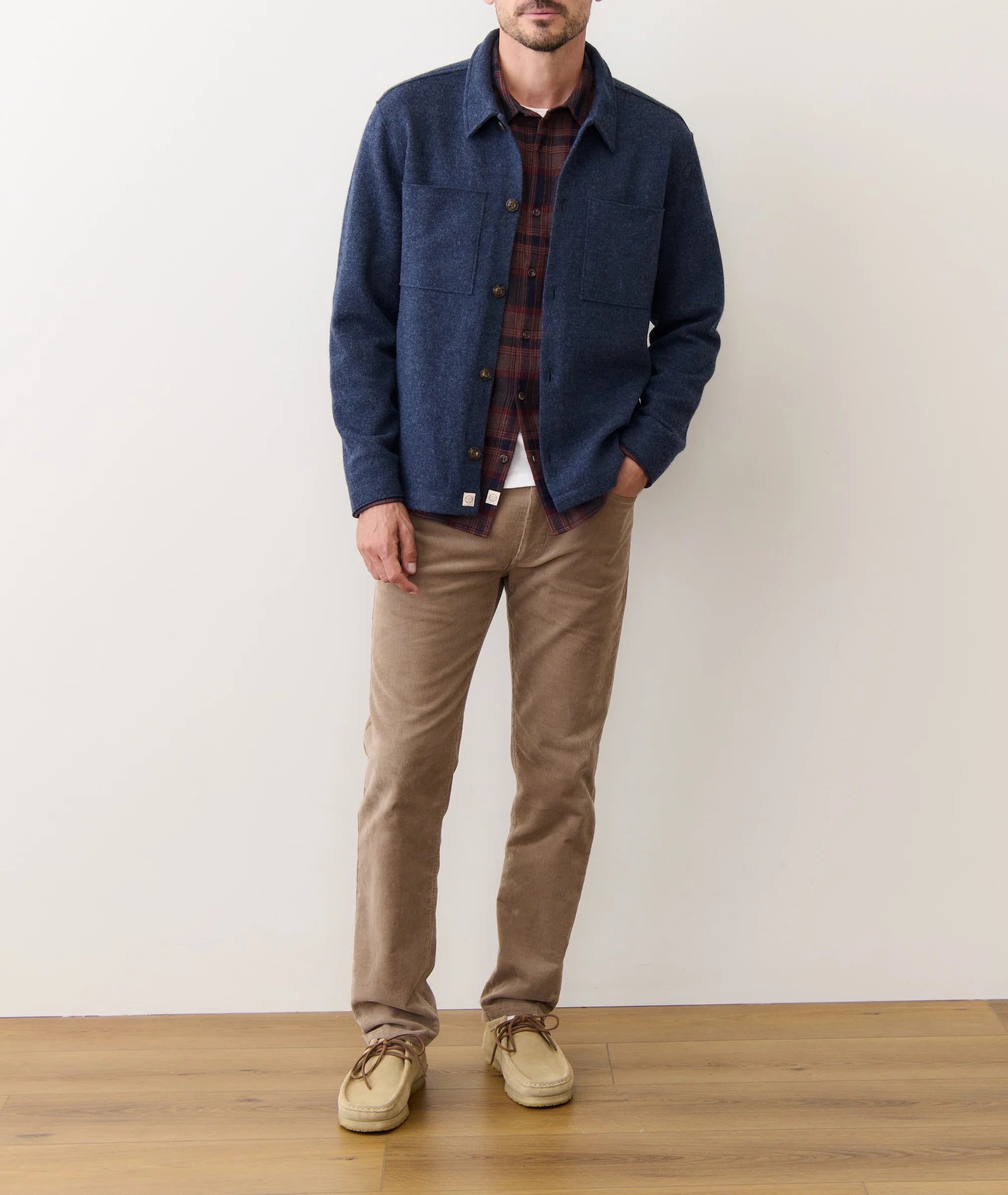 This overshirt is made with a soft but sturdy 320 GSM wool that's been boiled to bring the fibers closer together. That means you get the warmth of a thicker fabric, with a more compact look. Science is cool, right?