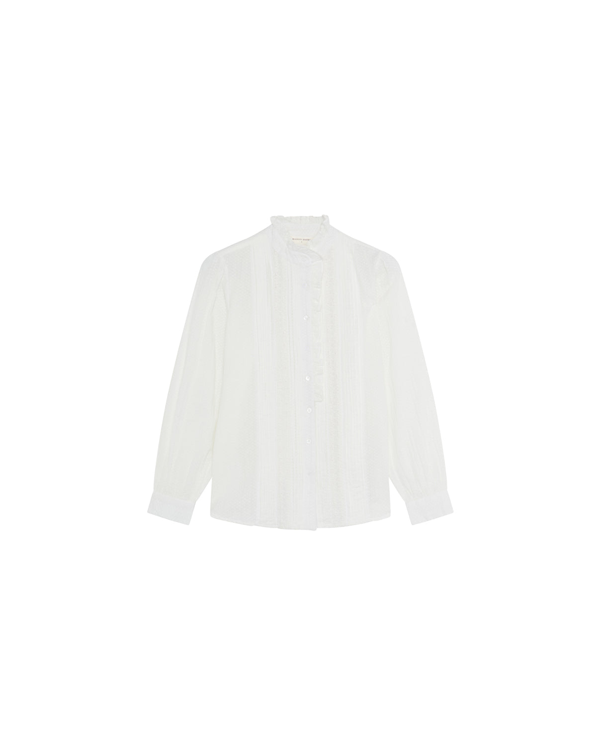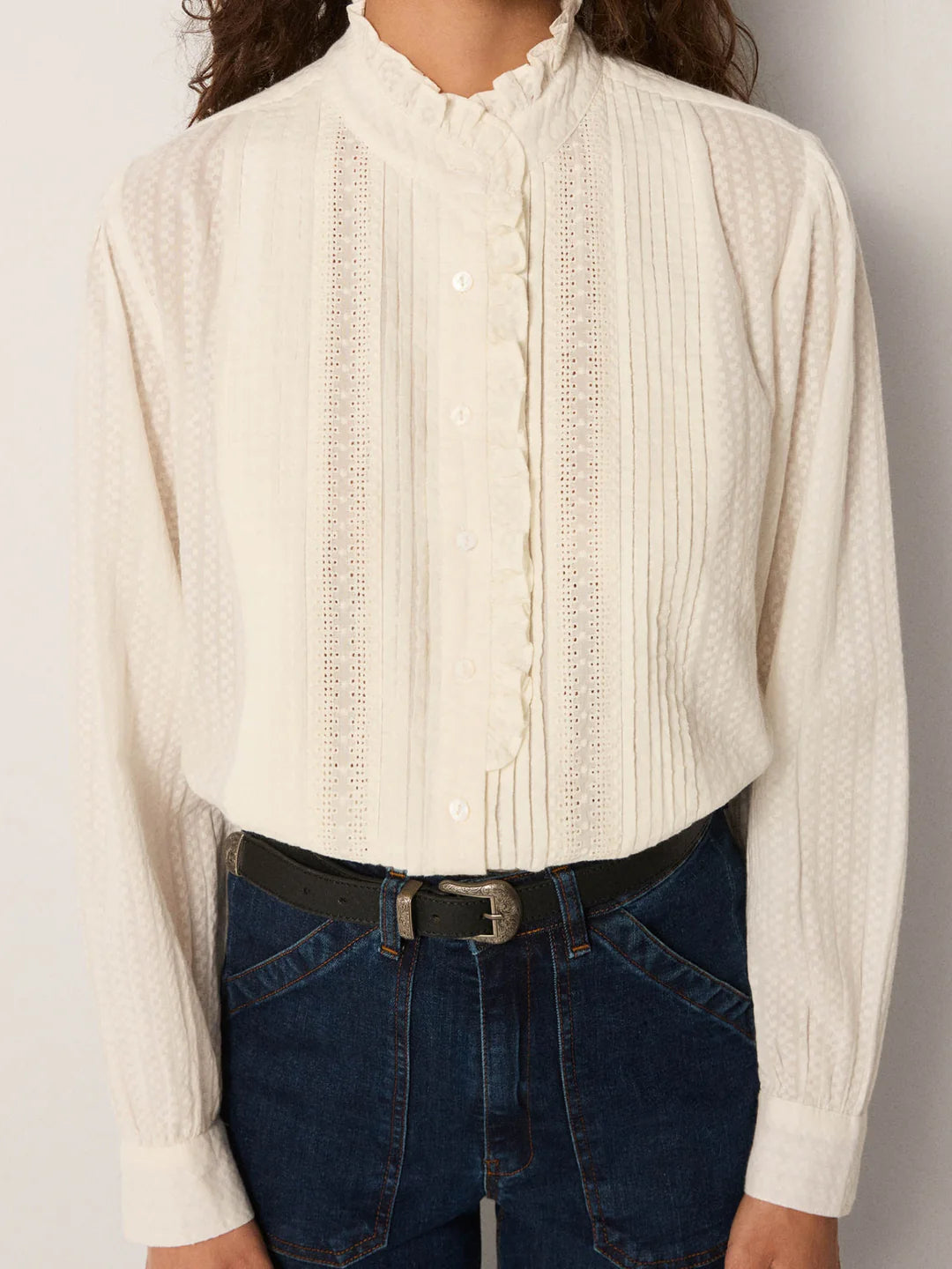 Crafted in soft cotton dobby with shiffly, the Bella Blouse brings a subtle play of textures with delicate pin-tucks and ruffle detailing along the front.