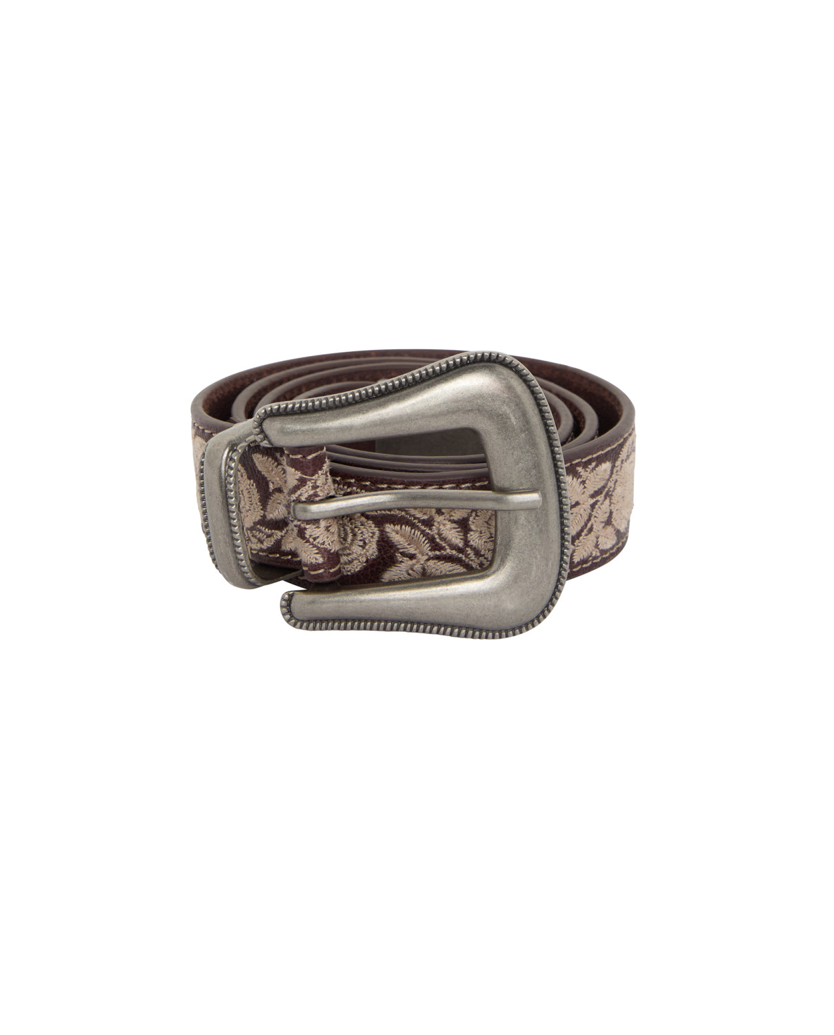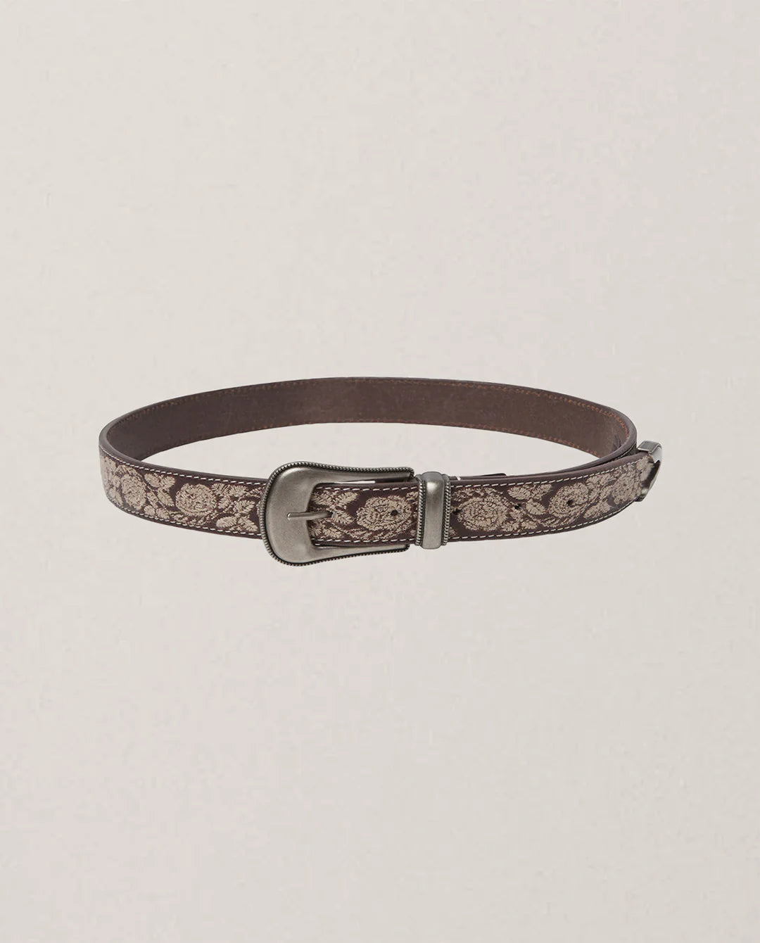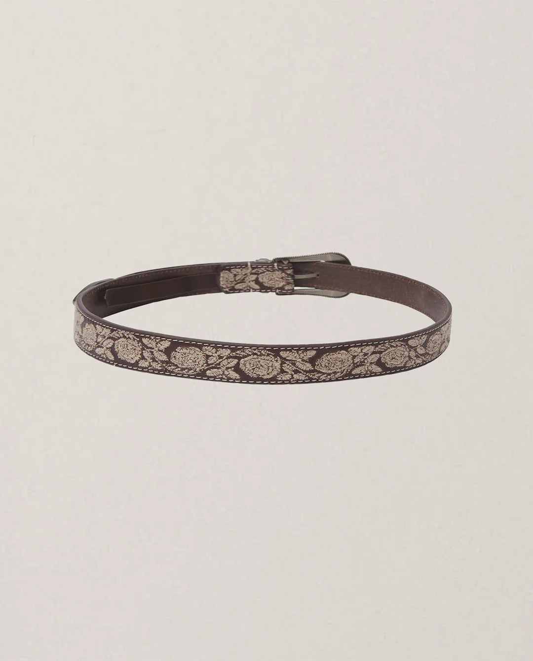 Guadalupe is designed in rich jacquard with an intricate floral motif in a brown leather base. Its brushed silver buckle adds a rustic touch, creating a perfect balance between artisanal detail and everyday versatility. A statement belt that elevates any outfit with subtle sophistication.
