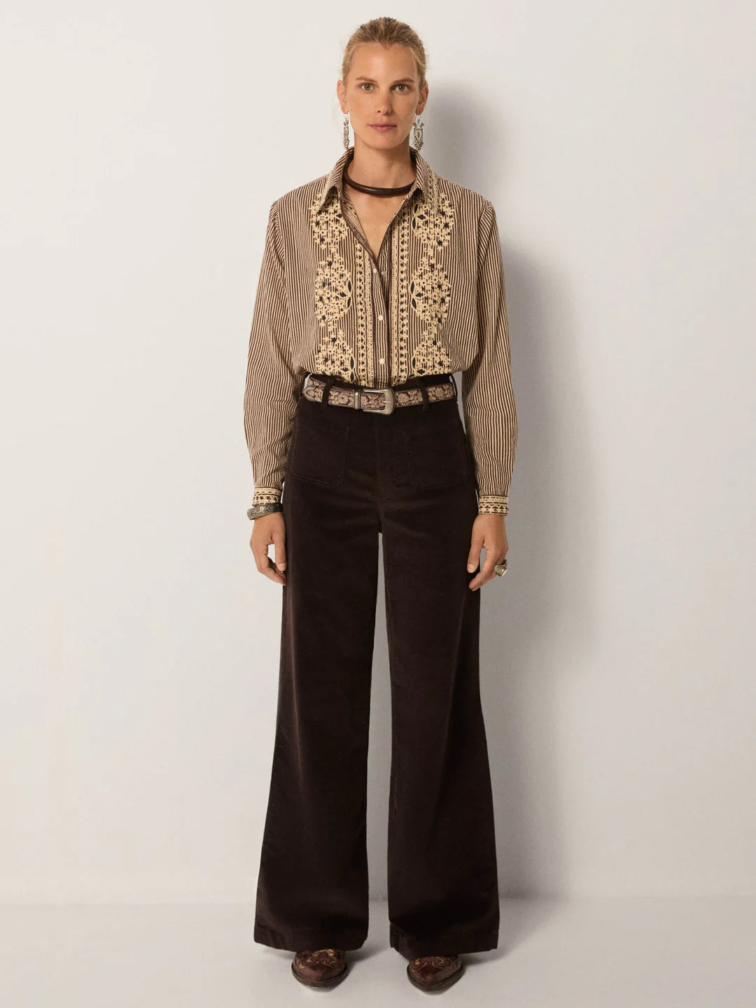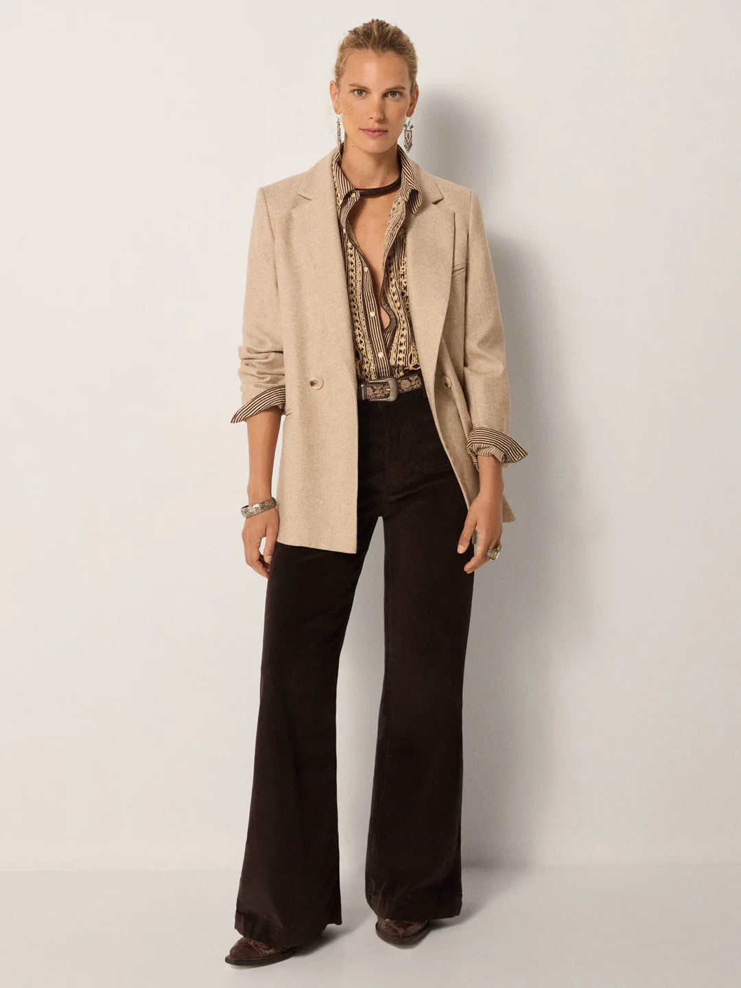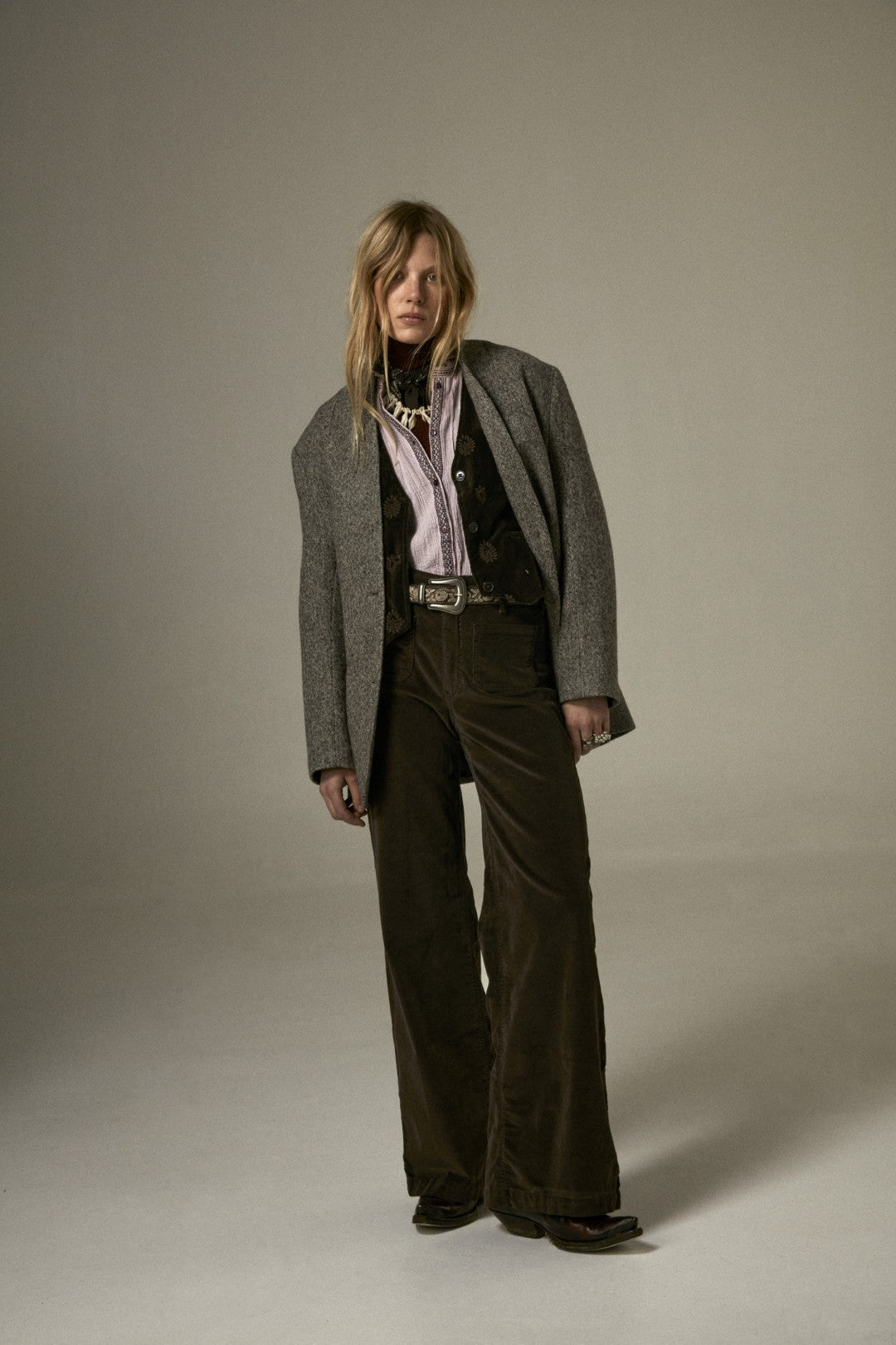 The texture is thick and velvety, offering a tactile experience that speaks of rugged landscapes and quiet nights by the fire. Each detail is intentional, from the high waist that accentuates your silhouette to the flared legs that add a touch of drama with every step.