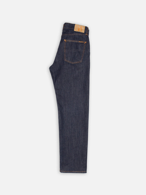 High-waist, regular-fit jeans with a straight leg, crafted from regenerative organic cotton in a beautifully simple deep blue wash. The inspiration behind this wash is refreshingly straightforward: a single home wash of dry denim. Crafted from vintage-style deep indigo denim with a medium slub character, the treatment shifts the hue from a dark blue to a rich, redcast blue, while transforming the denim's texture from flat to beautifully irregular and textured.